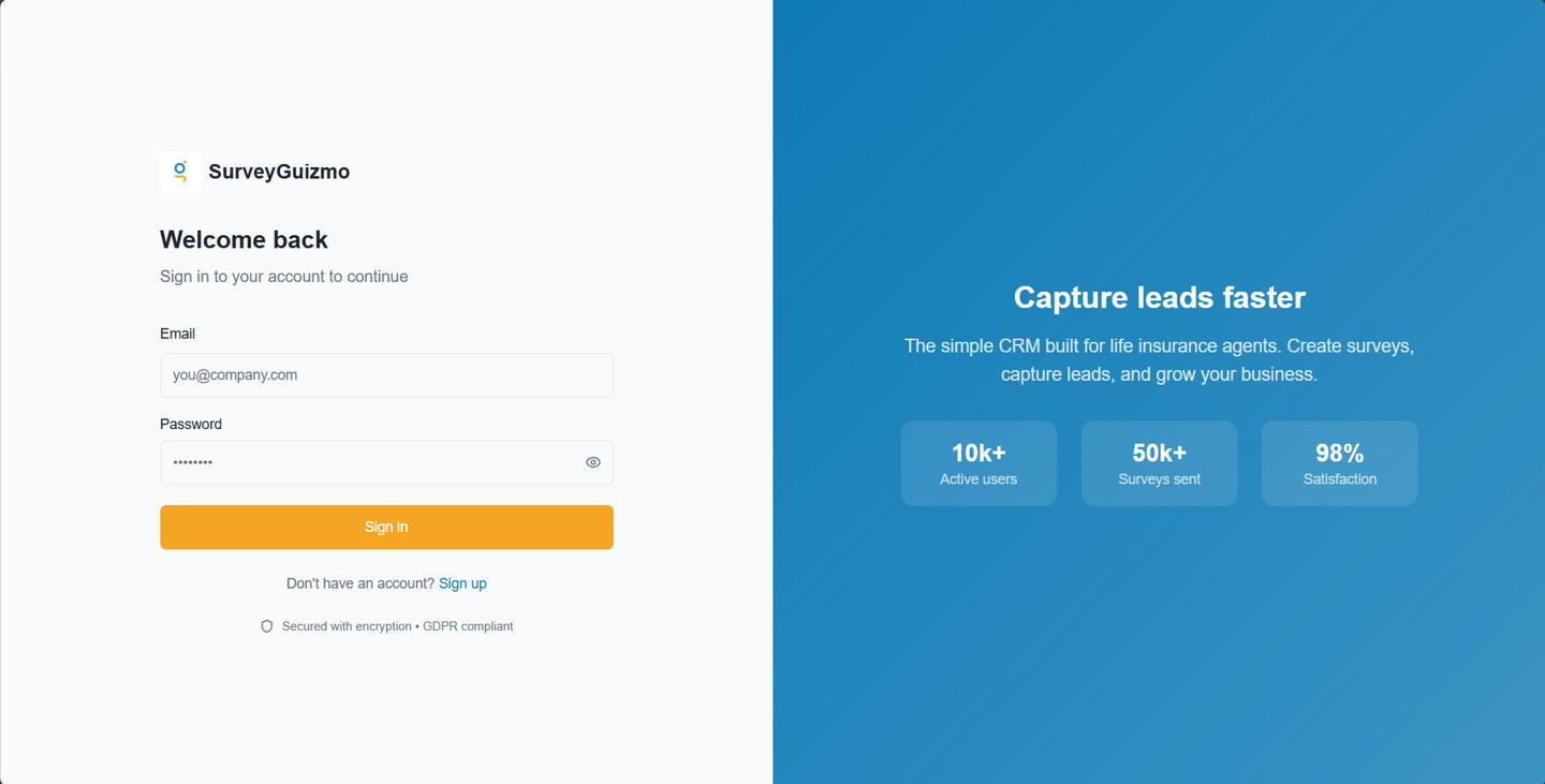 Get access to SurveyGuizmo, the all-in-one CRM that helps you manage your life insurance leads, featuring integrated surveys, chats and calls.